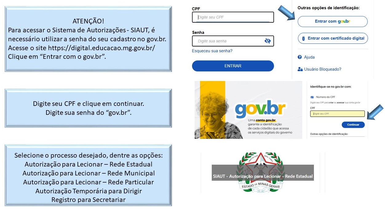 O SIAUT é o sistema da SEE – MG que permite aos cidadãos solicitarem e receberem as autorizações. Para utilização do SIAUT, o candidato deve estar cadastrado no site do “gov.br”.